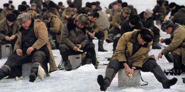 на свой рыбацкий ящик, в огромных бахилах, тулупе, опёршись на ледобур, молча созерцает людской поток, размышляя о